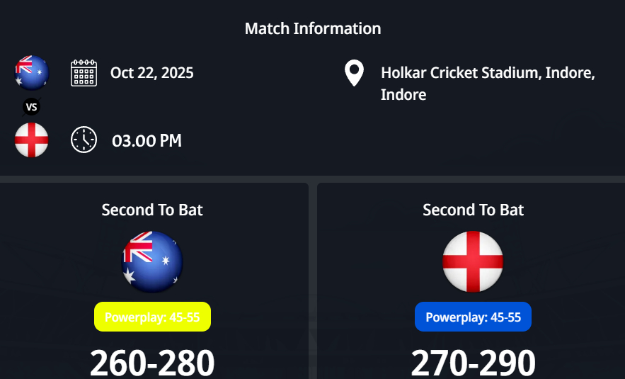 ඔක්තෝබර් 22 වන බදාදා ඉන්දෝර් හි හොල්කාර් ක්රිකට් ක්රීඩාංගනයේදී පැවැත්වෙන 2025 කාන්තා ලෝක කුසලානයේ 23 වන තරගයේදී ඕස්ට්රේලියානු කාන්තා කණ්ඩායම සහ එංගලන්ත කාන්තා කණ්ඩායම අතර තරඟ වදිනු ඇත.